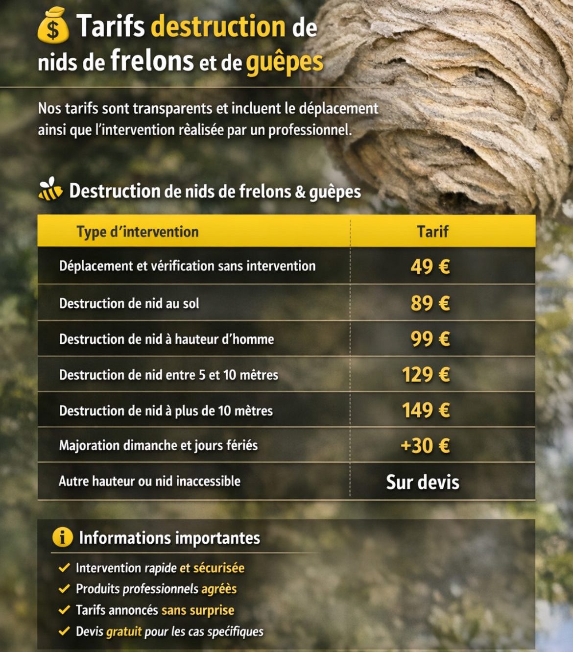 - nid en hauteur ou difficile d’accès : tarif ajusté
